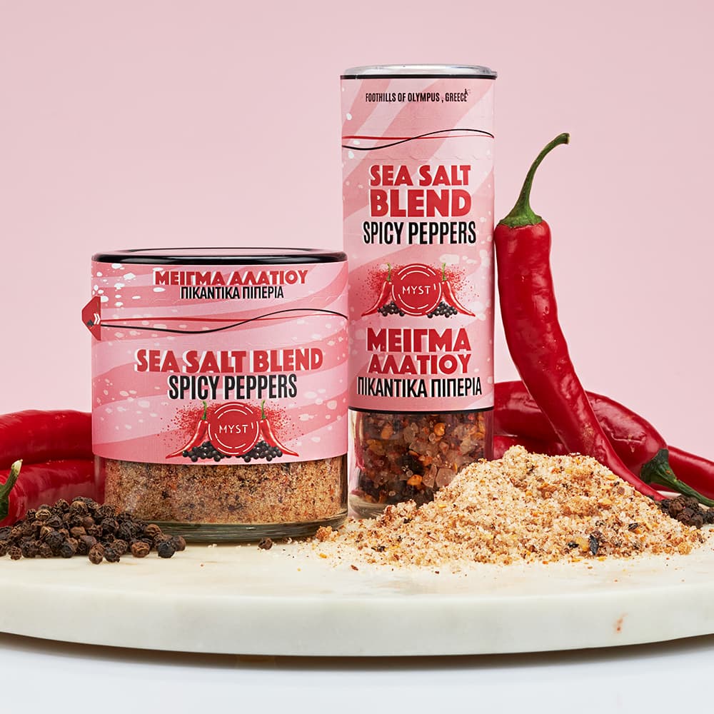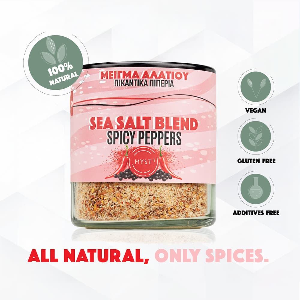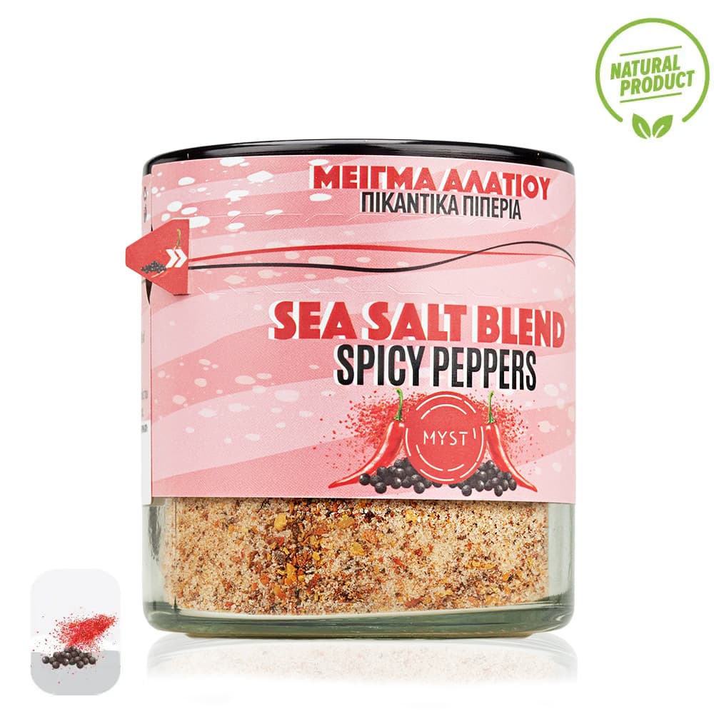 Pure sea salt from the foot of Olympus spicy florinis pepper ,boukovo and black pepper. Tasty, aromatic and spicy!